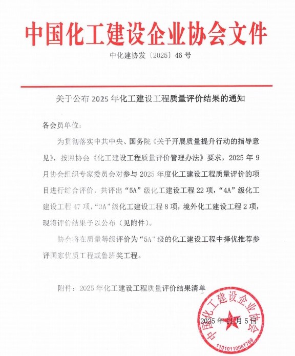 2025年11月5日,中国化工企业建设协会下发《关于公布2025年化工建设工程质量评价结果通知》(中化建协发【2025】46号文),正式将河图承接的“中国航油集团南方储运有限责任公司湛江基地项目(一期)工程”评选为2025年度5A级优质化工建设工程。